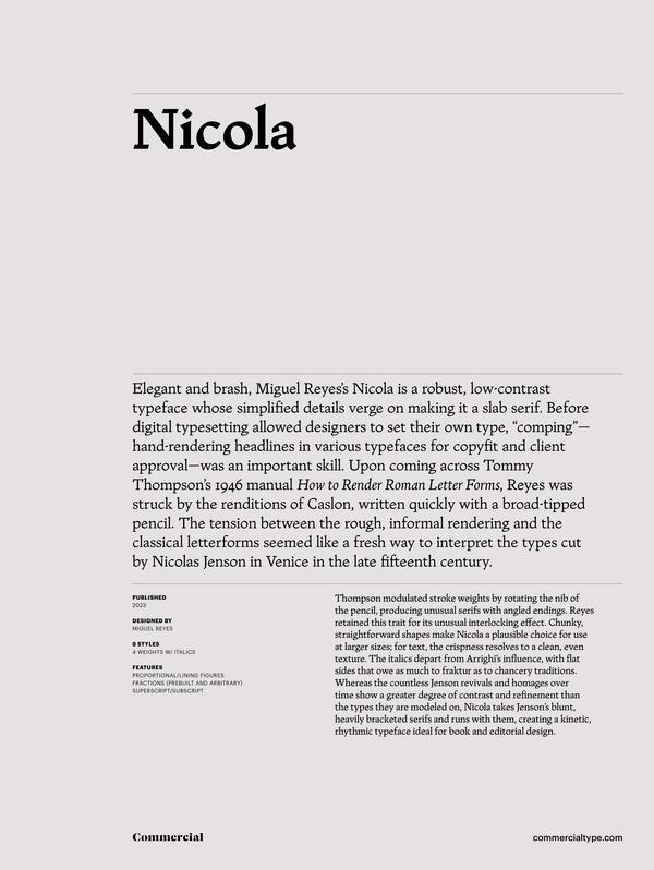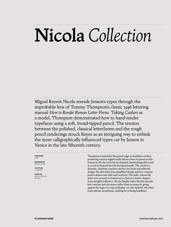 Before digital typesetting let designers set their own type, “comping”— hand-rendering headlines in various typefaces for copyfit and client approval— was an important skill. Miguel Reyes came across Tommy Thompson’s classic 1946 manual How to Render Roman Letter Forms and was struck by his renditions of Caslon, written quickly with a broad-tipped pencil. Thompson modulated the stroke weight by rotating the nib of the pencil, creating unusual serifs with interlocking, angled endings. Reyes thought that the tension between the rough, informal quality of the rendering and the classical letterforms would be a fresh way to interpret the types cut by Nicolas Jenson in Venice in the late fifteenth century. Elegant and brash, Nicola is a robust, low-contrast typeface whose simplified details verge on making it a slab serif.
